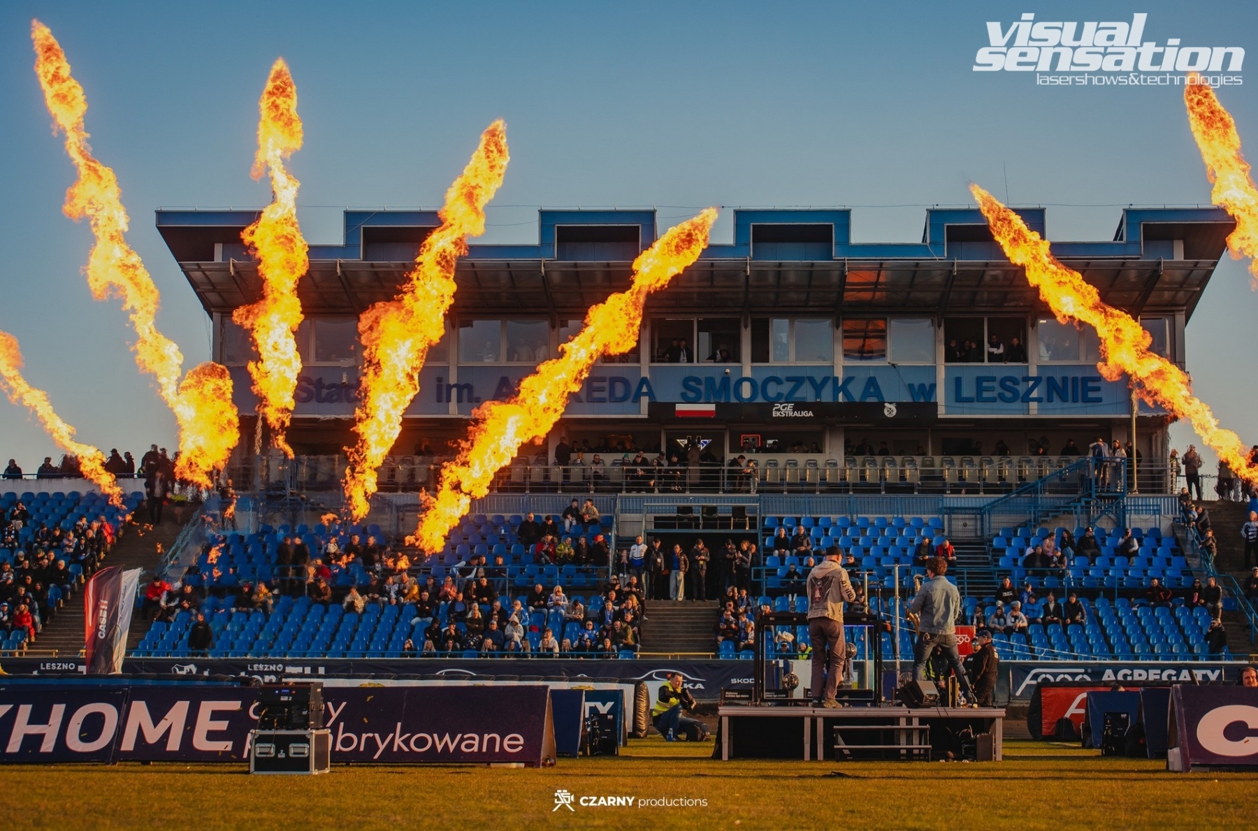 W ramach realizacji odpowiadaliśmy za efekty specjalne na stadionie żużlowym, w tym buchające ognie sceniczne oraz wyrzuty dymnego CO₂, które podkreślały najważniejsze momenty meczu żużlowego i budowały atmosferę na trybunach. Efekty były zsynchronizowane z przebiegiem wydarzenia, wzmacniając dynamikę rywalizacji i emocje kibiców.